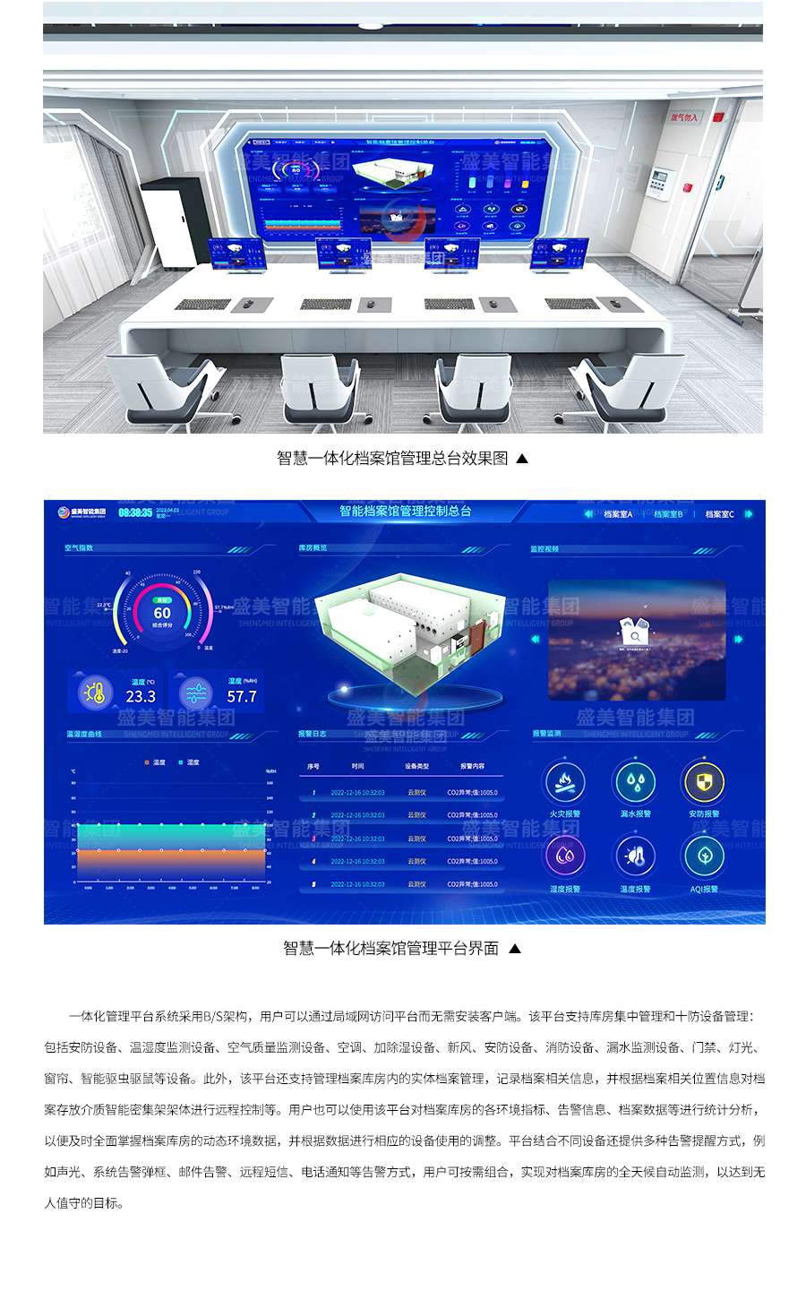 档案库房一体化管理系统针对智能密集架管理系统、库房安防系统、恒温控制系统、恒湿净化消毒控制系统、烟雾报警或气体消防系统、电子档案管理系统、漏水报警系统等设备状态进行统一管理。各子系统的数据采集、数据存储、数据分析处理、报警、查询、报表及部分子系统的设置等功能全部通过环境监控平台实现。图形化显示,支持库房电子地图功能,对库房所有运行设备显示运行状态。